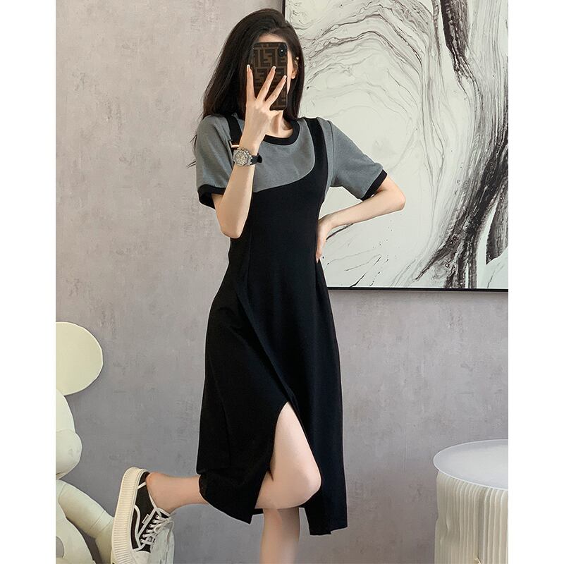 【森森家シリーズ】ワンピース OL/通勤 フェイクレイヤード 切り替え 半袖 ブラック 大きいサイズ M L XL 2XL 3XL 4XL
