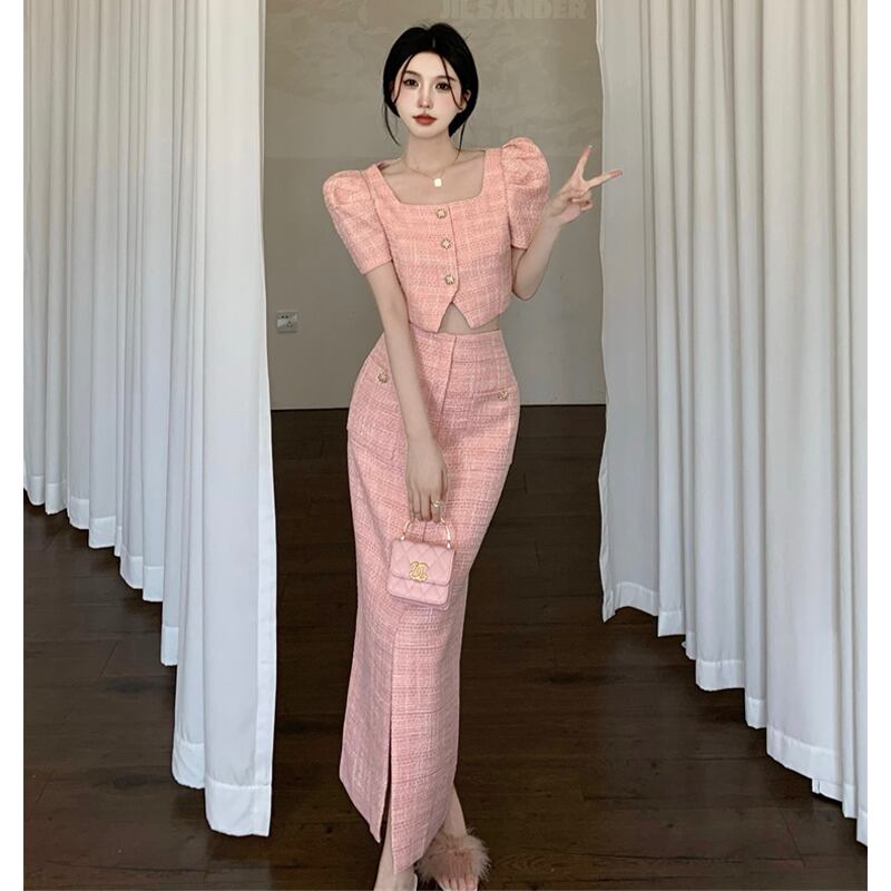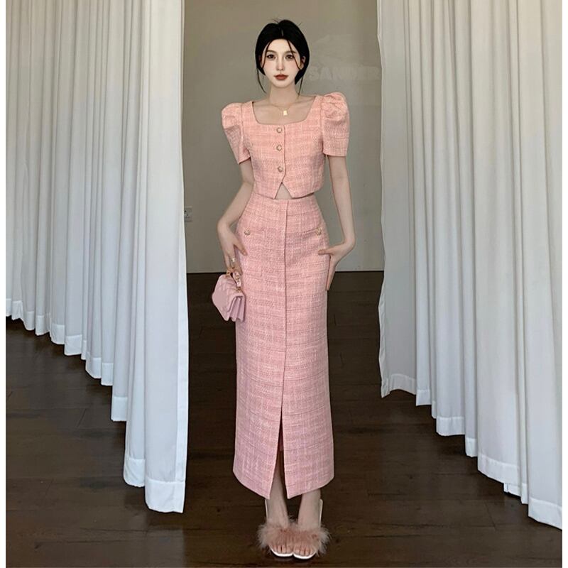 セットアップ ツイード エレガント スクエアネック アウター+スカート ピンク S M L