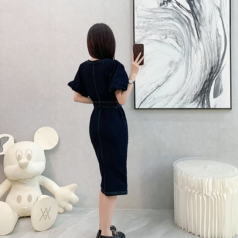 ワンピース ベルト付き 優雅 パフスリーブ デニム スクエアネック ダークブルー S M L XL
