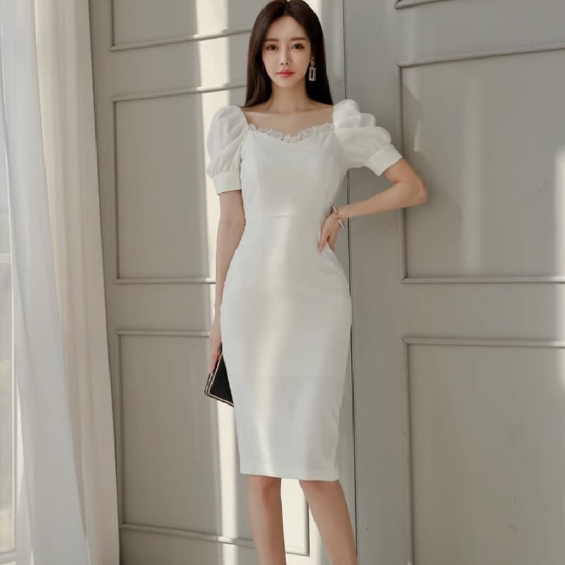 ワンピース スクエアネック 白 パフスリーブ 無地 ホワイト S M L XL