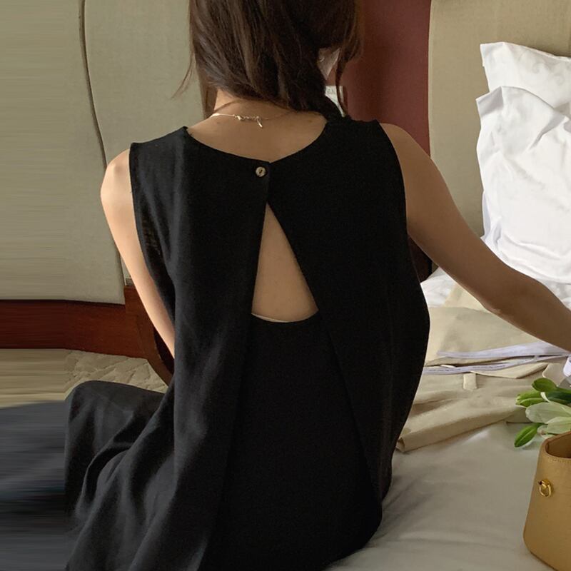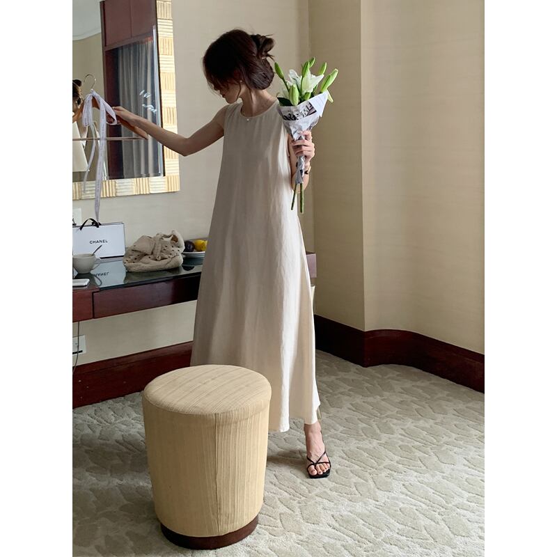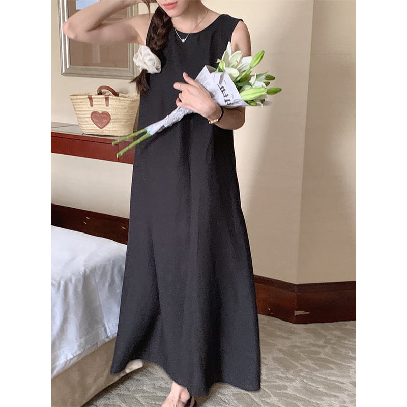 ワンピース 無地 デザイン感 綿麻生地 ロング丈 ノースリーブ ブラック ベージュ