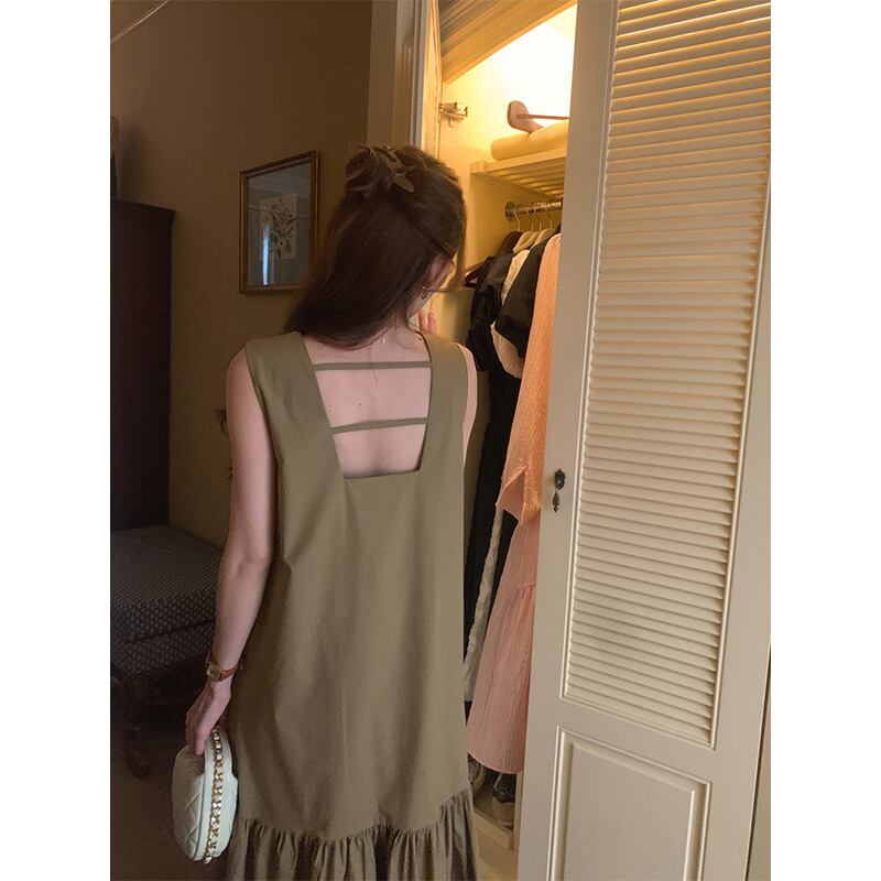 ワンピース 無地 背見せ デザイン感 ロング丈 ノースリーブ ブラック ライトブラウン ベージュ