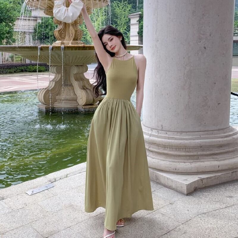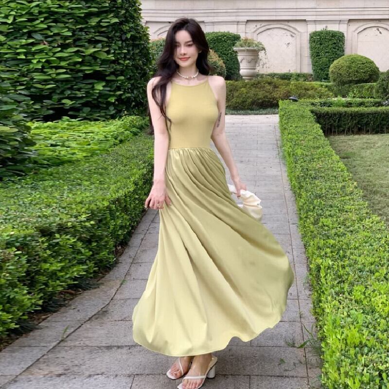 【ELEGANTSSシリーズ】ロングワンピース 2色展開 大振裾 ノースリーブ ライトグリーン ブラック S M L XL