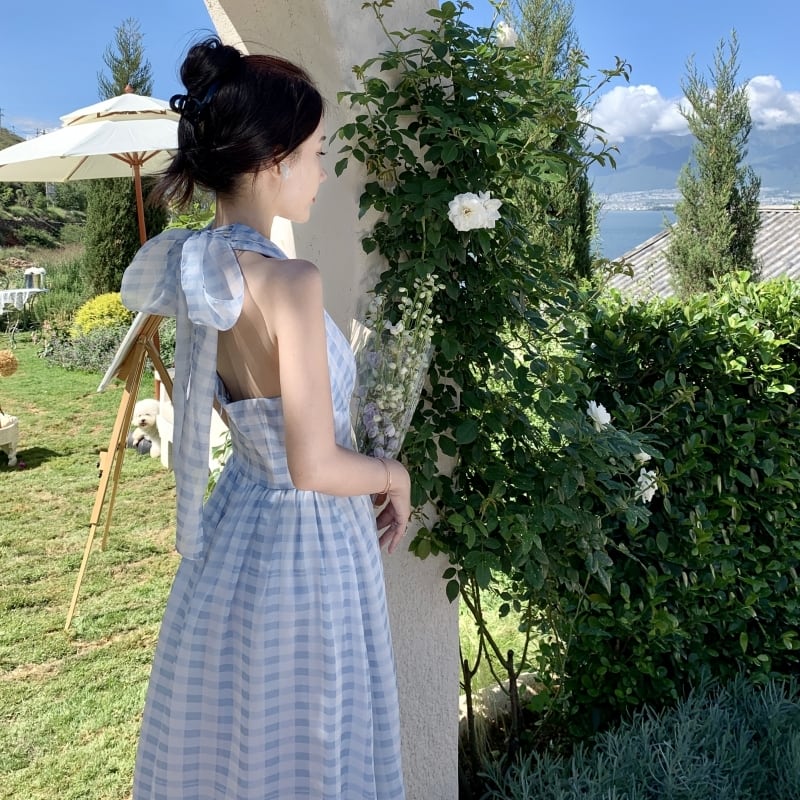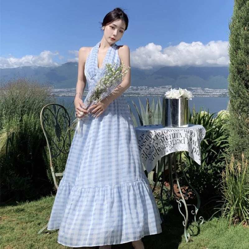 【SummerVacationシリーズ】ロングワンピース チェック柄 Vネック ライトブルー S M L XL