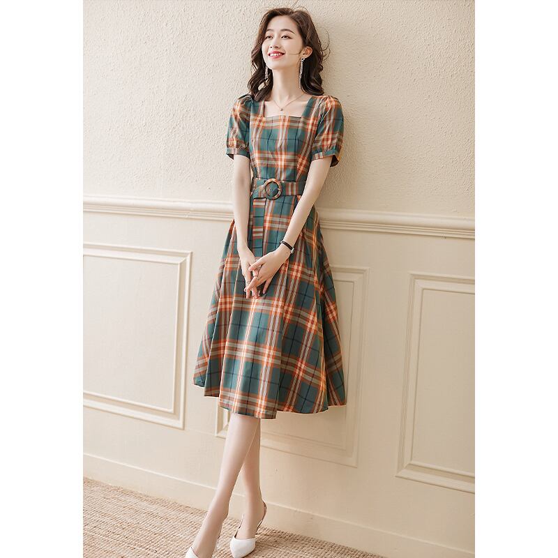 ワンピース スクエアネック OL/通勤 チェック柄 Aライン 優しい グリーン 大きいサイズ S M L XL 2XL