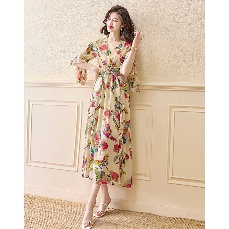 ワンピース Vネック 花柄 シフォン スカラップスリーブ フェアリー パプラム ベージュ S M L XL