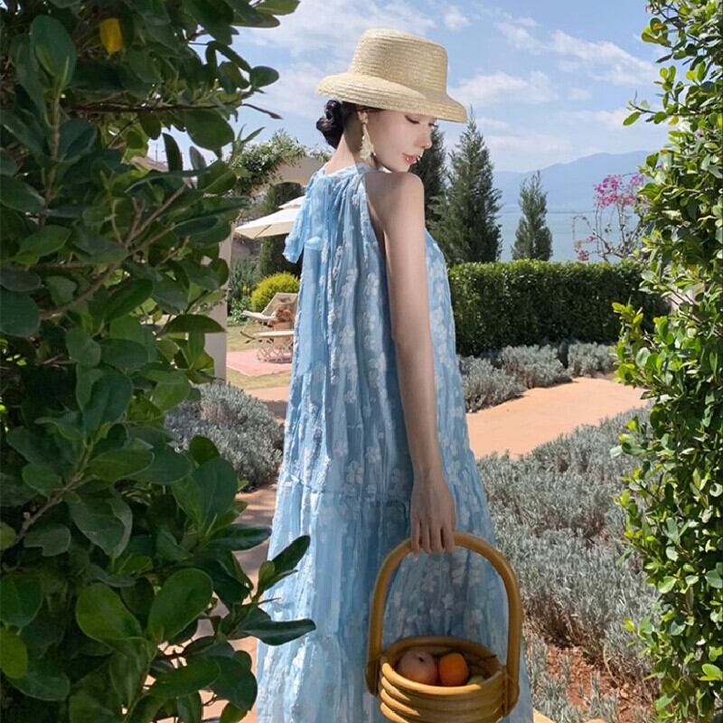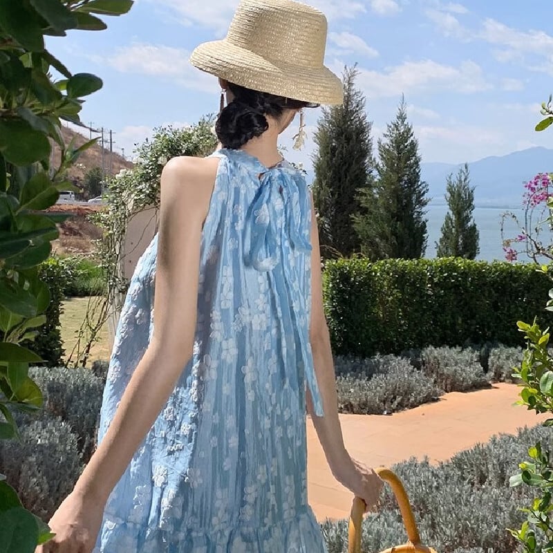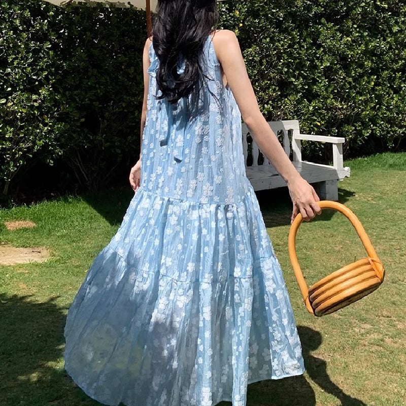 【SummerVacationシリーズ】ロングワンピース ノースリーブ 花柄 バックリボン ライトブルー S M L XL