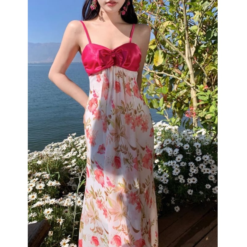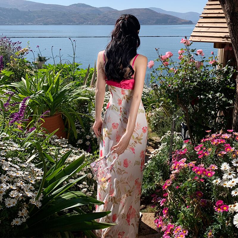 【SummerVacationシリーズ】吊りワンピース プリント 花柄 海 休日 S M L XL