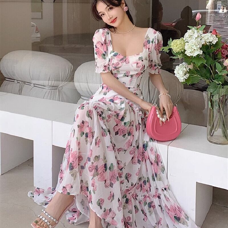 【SummerVacationシリーズ】ロングワンピース プリント 花柄 レトロ スクエアネック カジュアル S M L XL