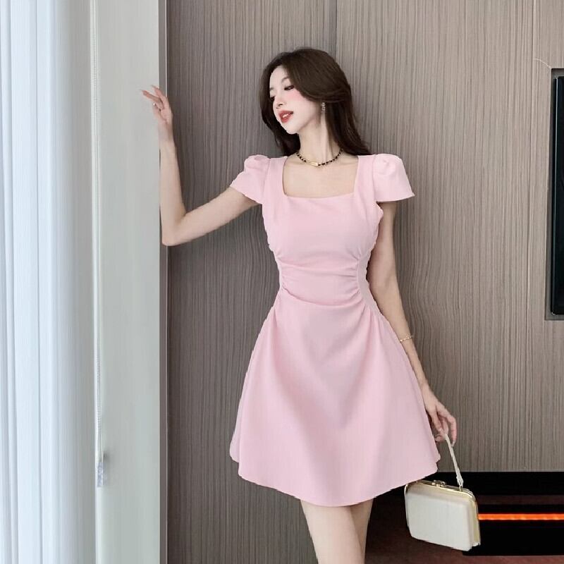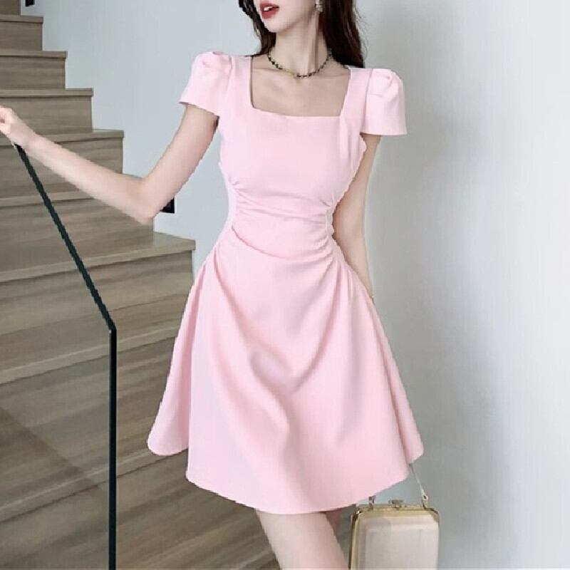 【CHERRYシリーズ】ワンピース 2色展開 スクエアネック Aライン 無地 ブラック ピンク S M L