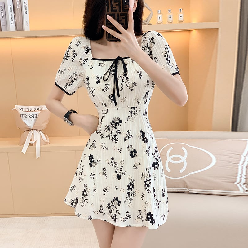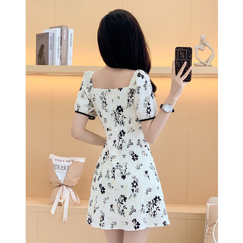 ワンピース 今季注目 OL/通勤 Aライン 花柄 スクエアネック ベージュ S M L XL