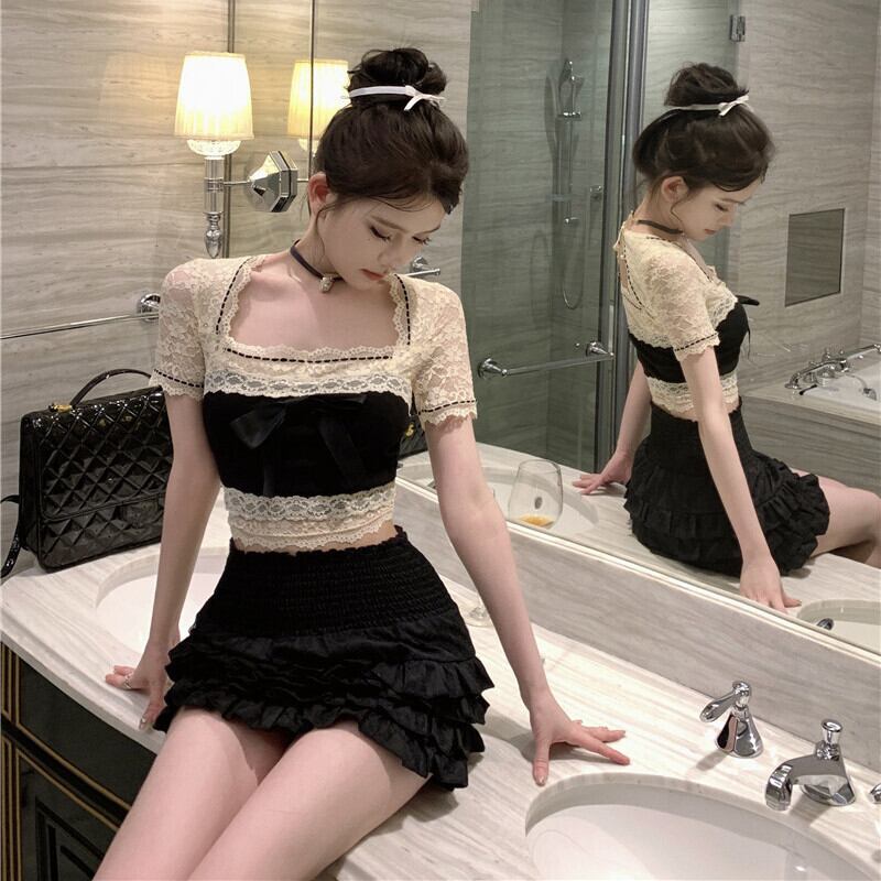 トップス シャツ スウィート レース 人気満々 配色 S M L