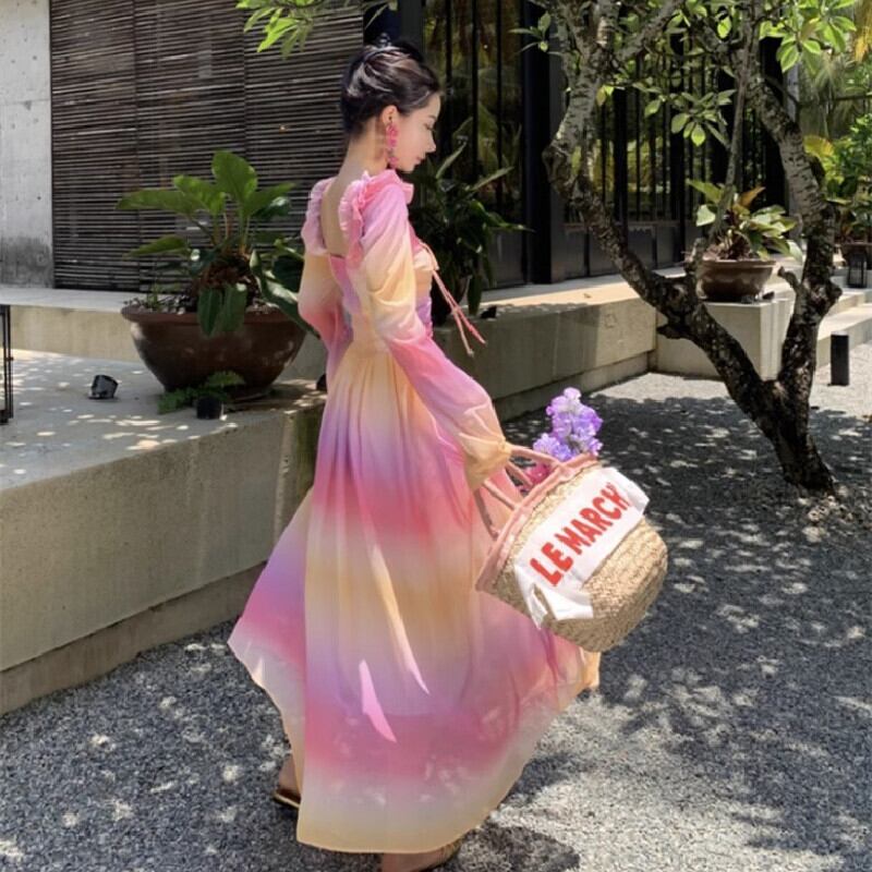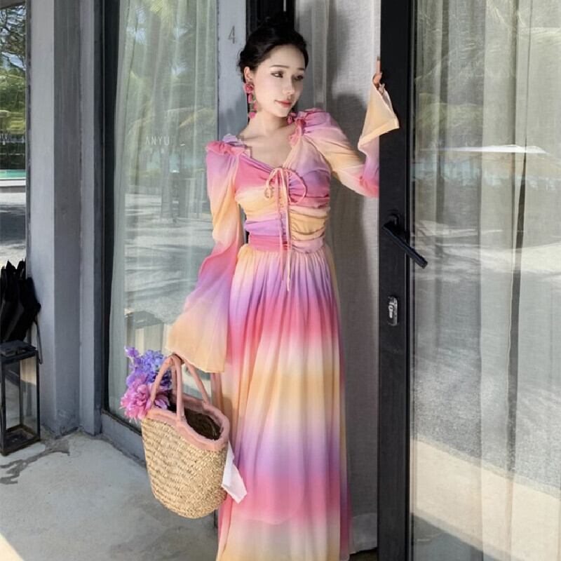【SummerVacationシリーズ】ロングワンピース ボートネックデザイン 配色 おしゃれ 撮影着 S M L