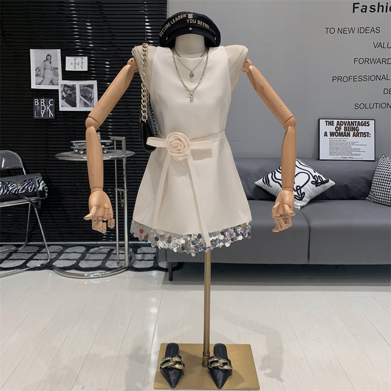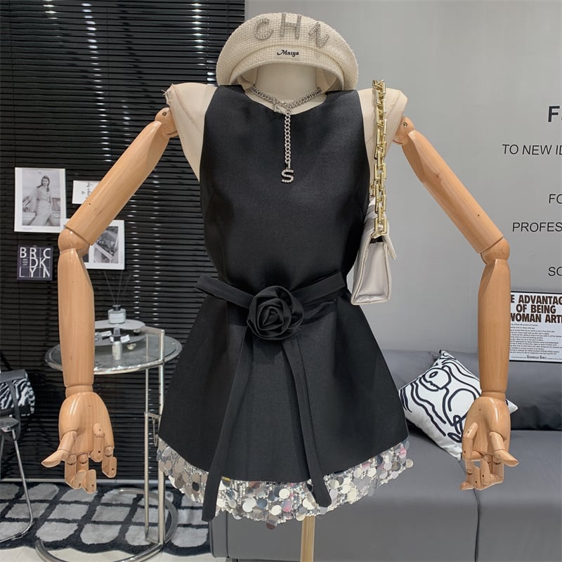 【Airi Styleシリーズ】ワンピース ノースリーブ スパンコール 3Dフラワー ブラック ベージュ S M