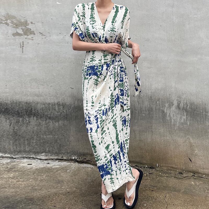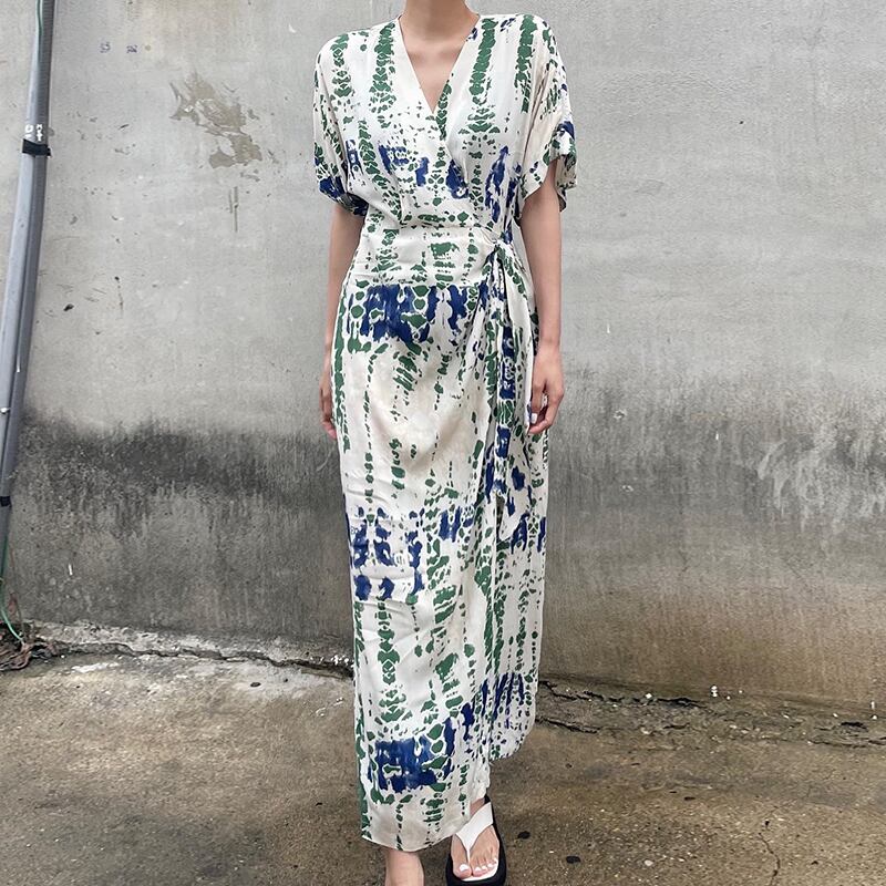 ワンピース 都市ファッション 気質UP 不規則カラー Vネック ロング丈 巻きつける