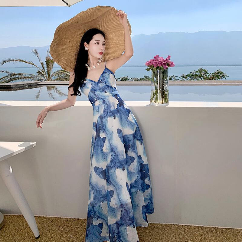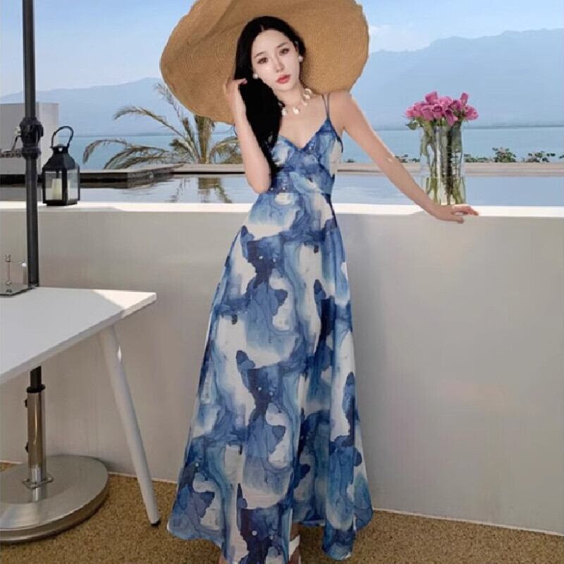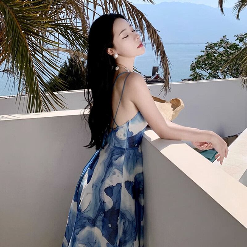 【SummerVacationシリーズ】吊りワンピース 水墨模様 バックオープン ロング丈 撮影着 休日 S M L XL