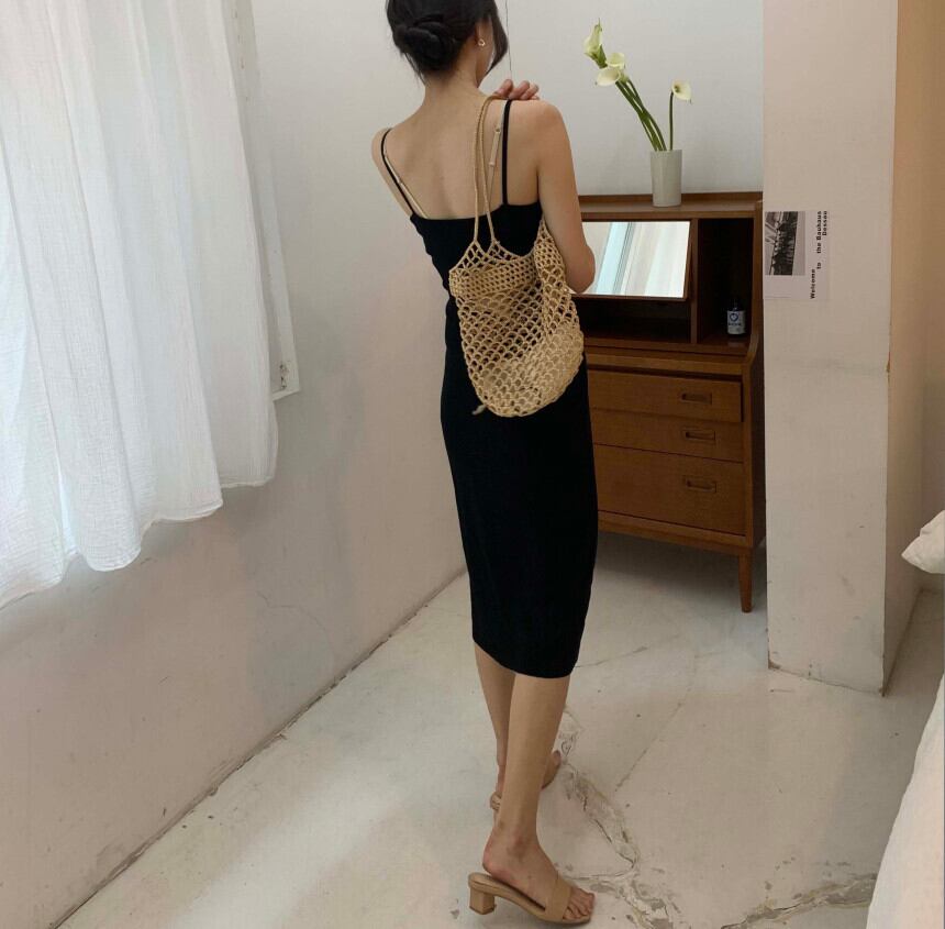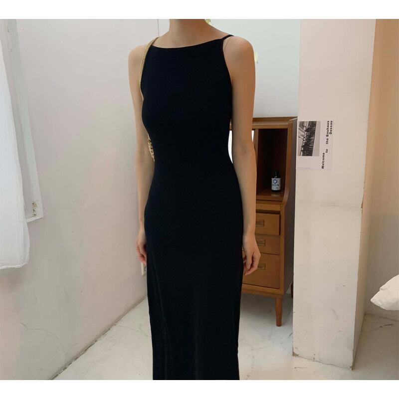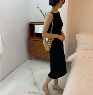 ワンピース 韓国系 無地 アームホール ロング丈 ブラック S M
