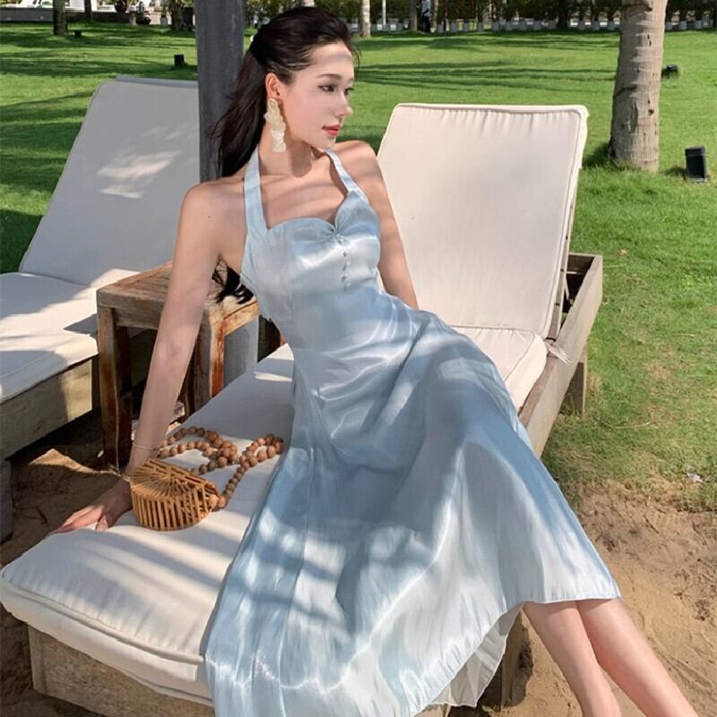 【SummerVacationシリーズ】ワンピース バックオープン スウィート 水色 デート ライトブルー S M L