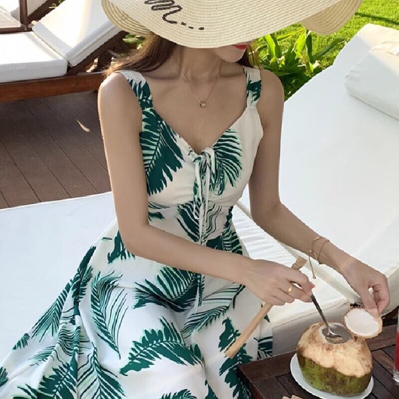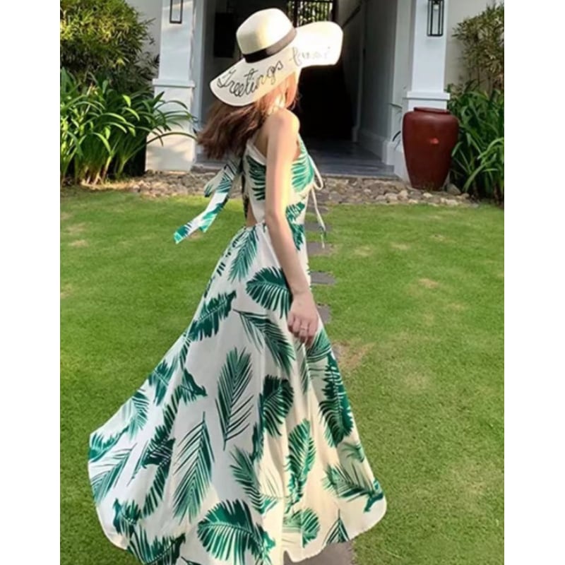 【SummerVacationシリーズ】ワンピース バックリボン 大振裾 休日 プリント グリーン S M L XL