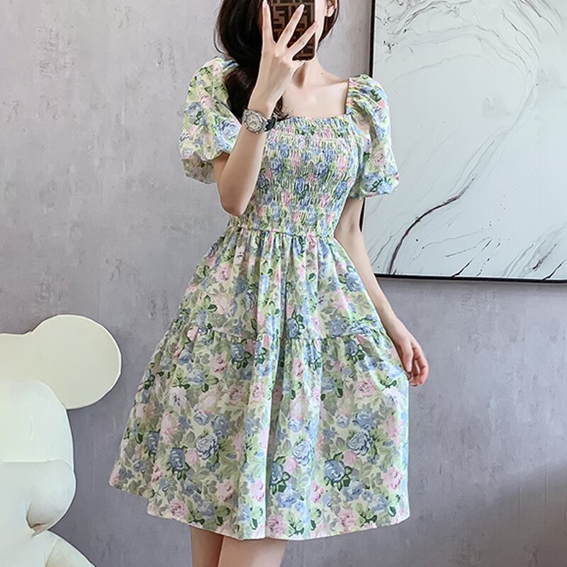 【森森家シリーズ】ワンピース かわいいスクエアネック 花柄 Aライン グリーン S M L