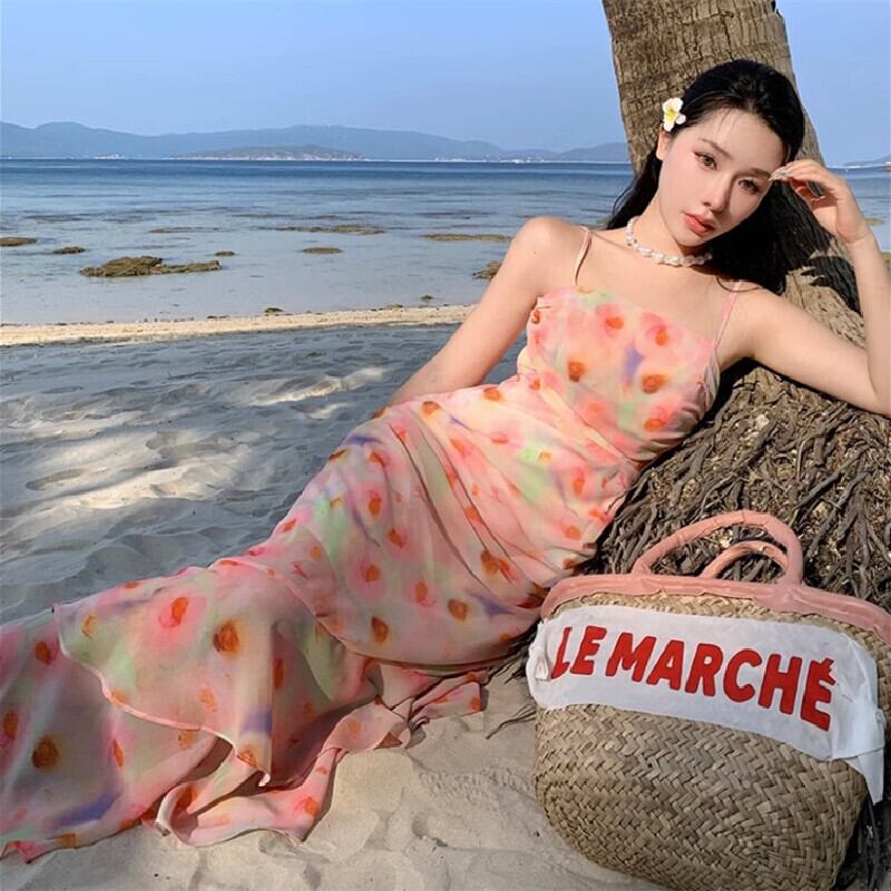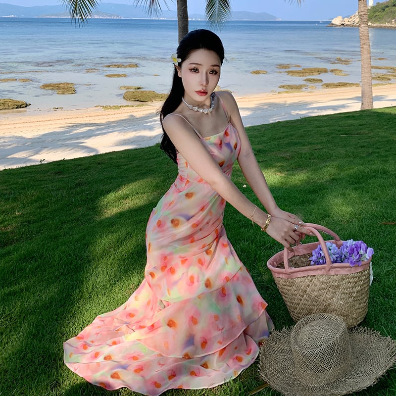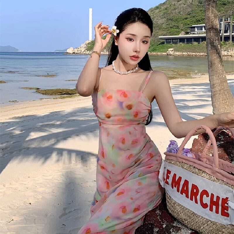 【SummerVacationシリーズ】吊りワンピース ロング丈 ペプラム 花柄 気質アップ S M L XL