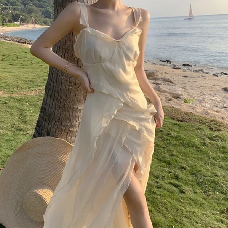 【SummerVacationシリーズ】吊りワンピース 2色展開 スリット 撮影着 グリーン ベージュ S M L