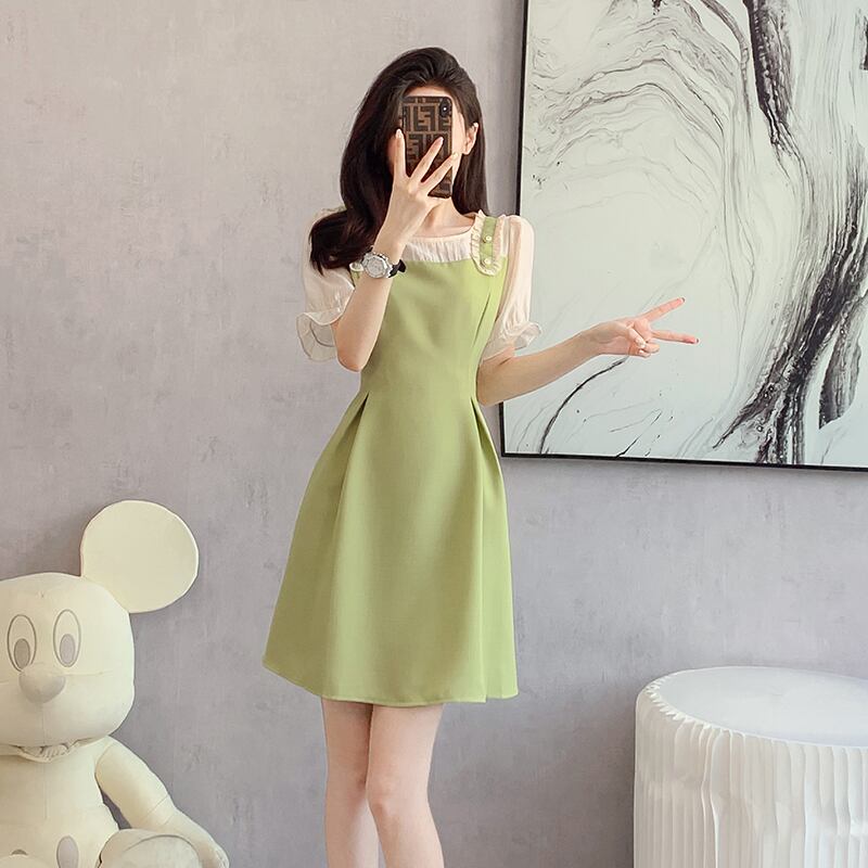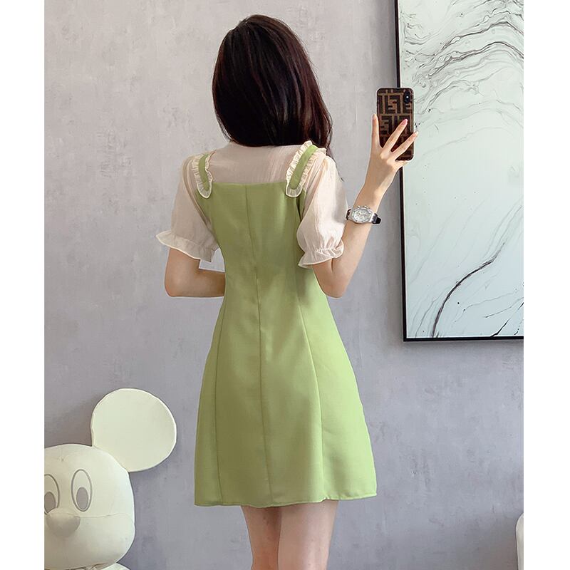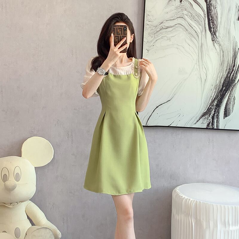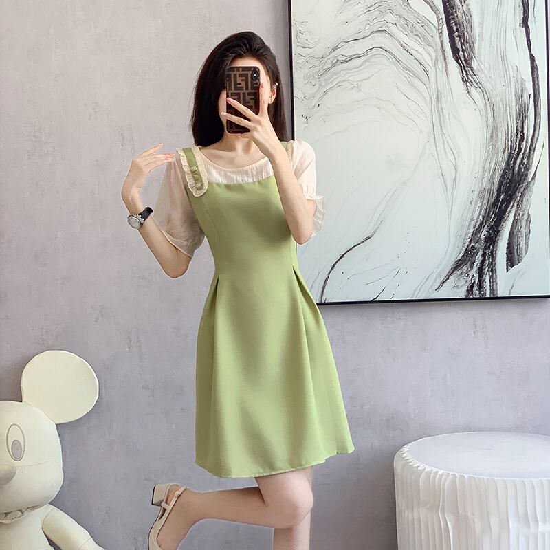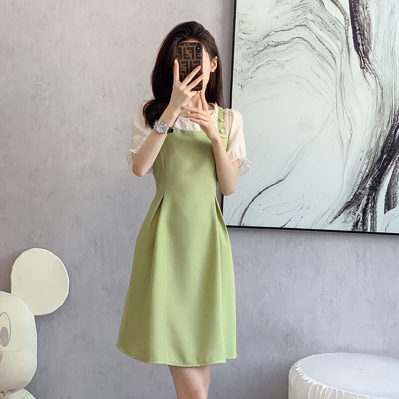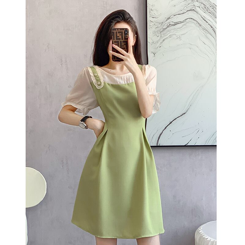 【森森家シリーズ】ワンピース フェイクレイヤード 切り替え Aライン グリーン S M L XL