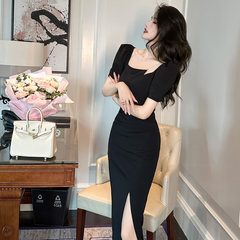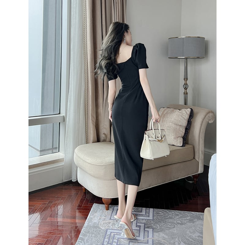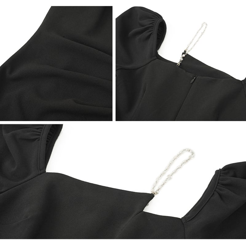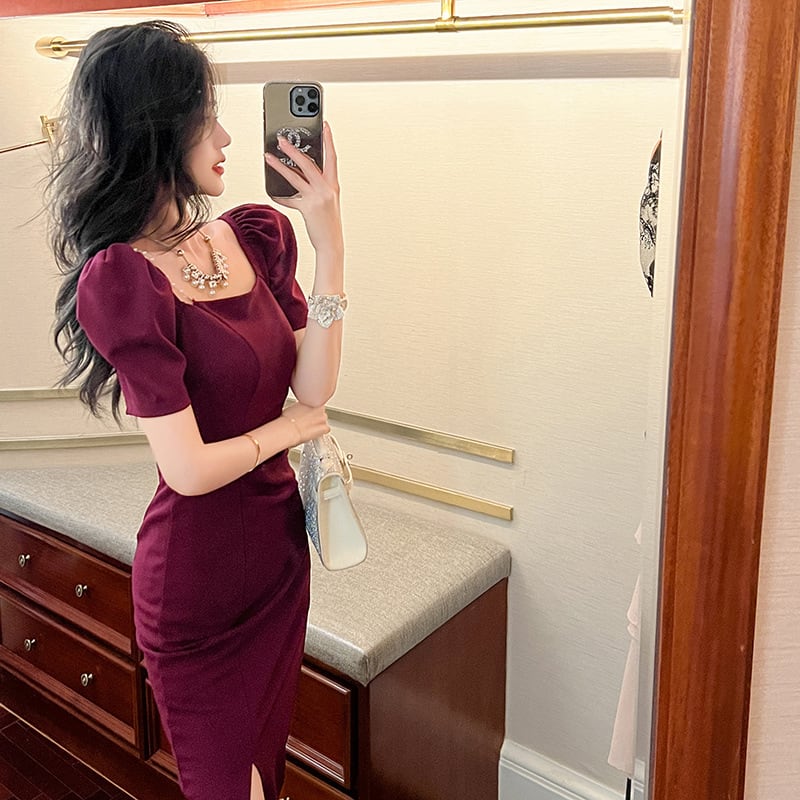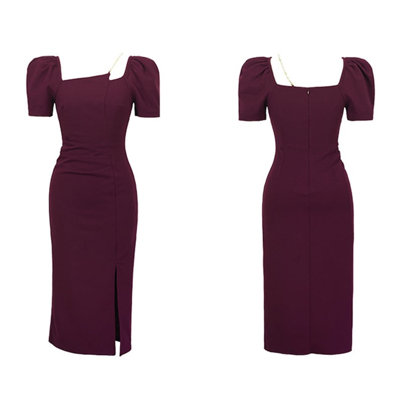【夕暮薔薇シリーズ】ワンピース OL/通勤 無地 スクエアネック ロング丈 ブラック パープル S M L XL