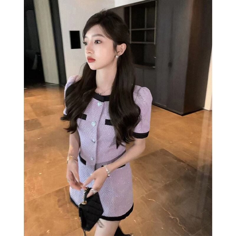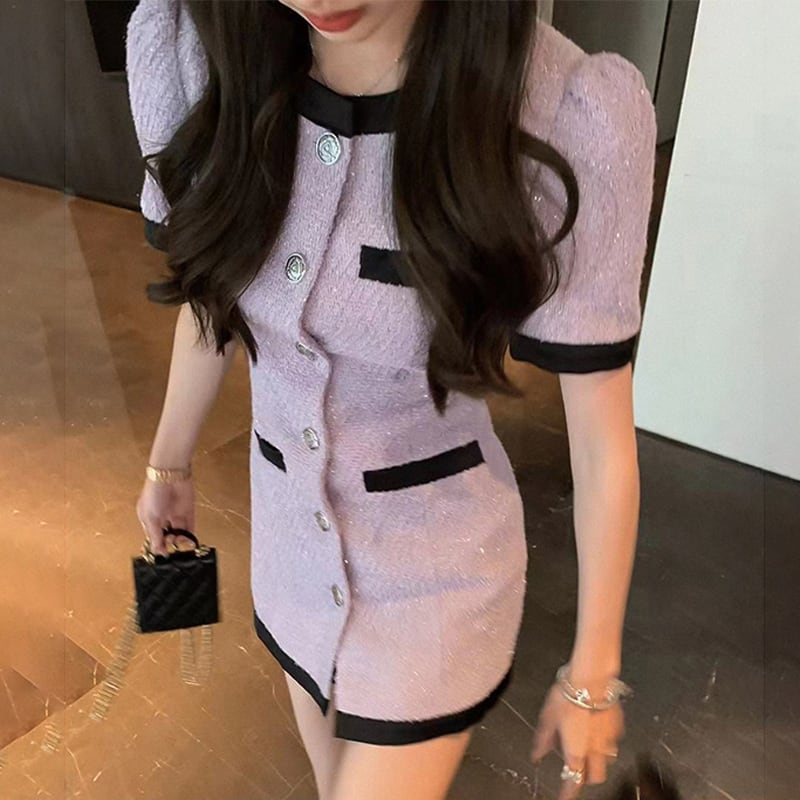 ワンピース 気質UP OL/通勤 切り替え 配色 ツイード パープル S M