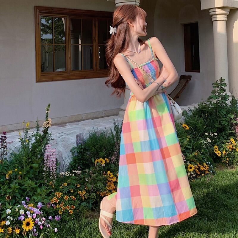 【SummerVacationシリーズ】吊りワンピース かわいい スウィート チェック柄 ロング丈 S M L