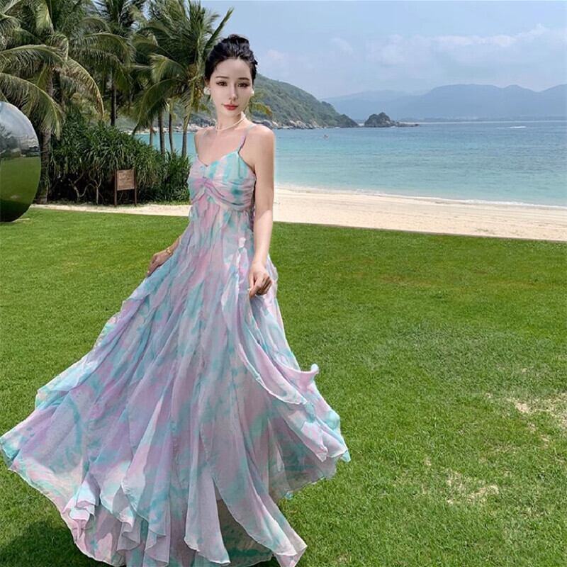 【SummerVacationシリーズ】吊りワンピース 大振裾 カラフル バカンス ペプラム S M L XL