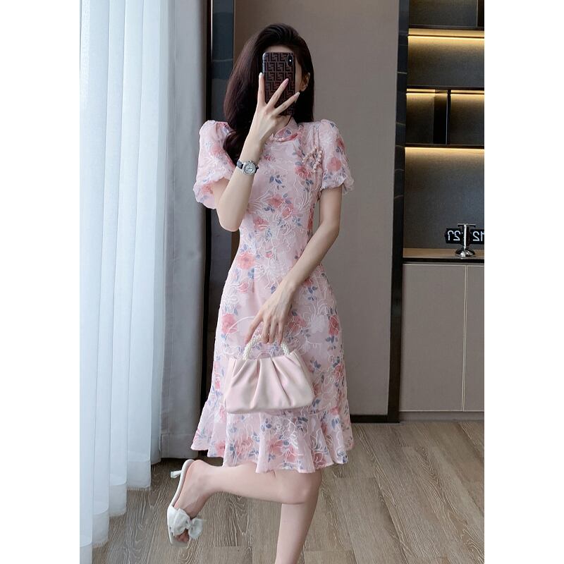【森森家シリーズ】ワンピース チャイナ風 シフォン 花柄 パプラム ピンク 大きいサイズ S M L XL 2XL