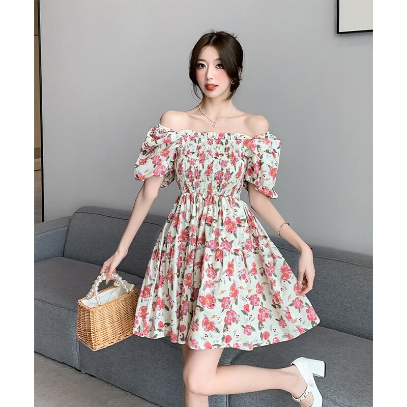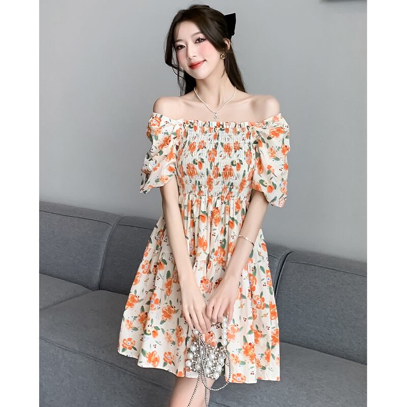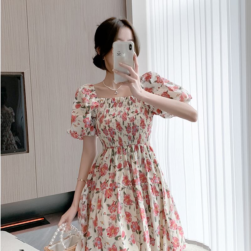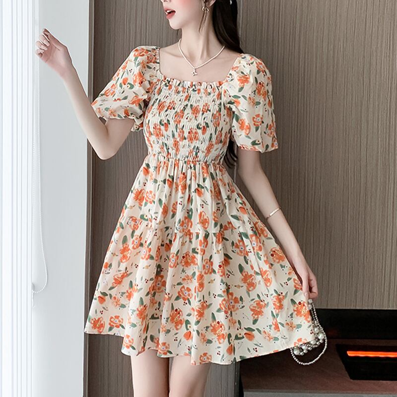 【森森家シリーズ】ワンピース スクエアネック Aライン 花柄 レッド オレンジ S M L XL