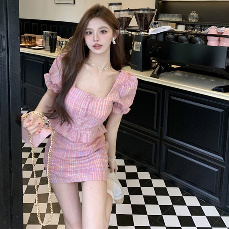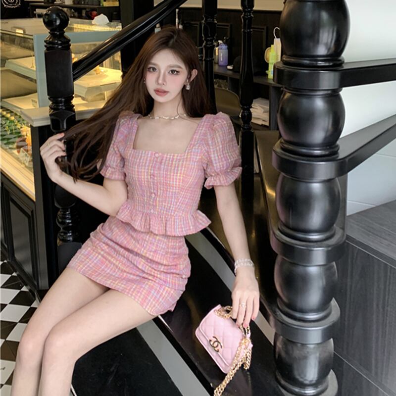 セットアップ スウィート ツイード オシャレ スクエアネック トップス+スカート ピンク XS S M L