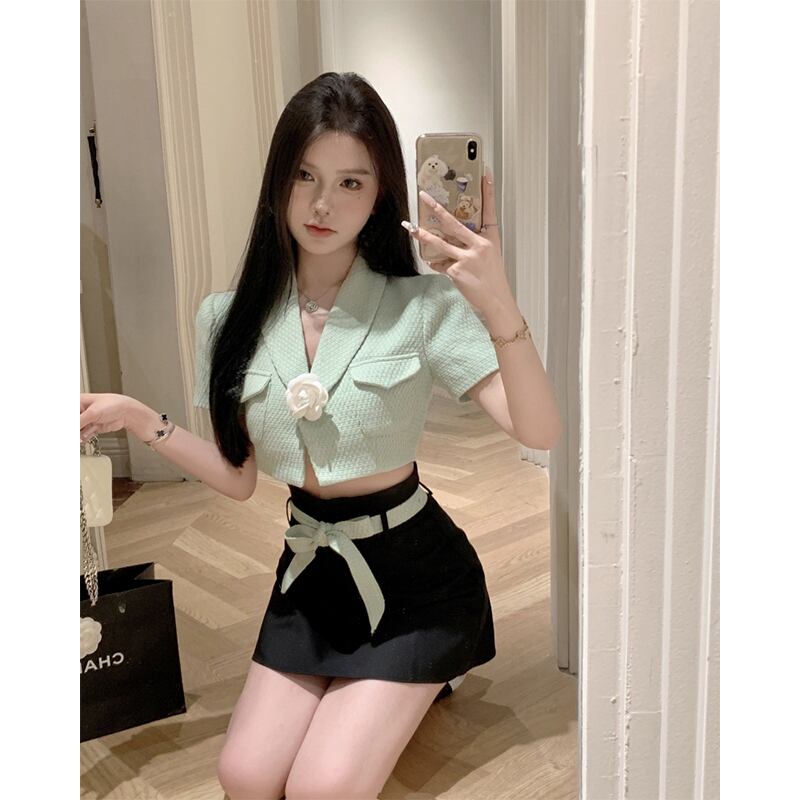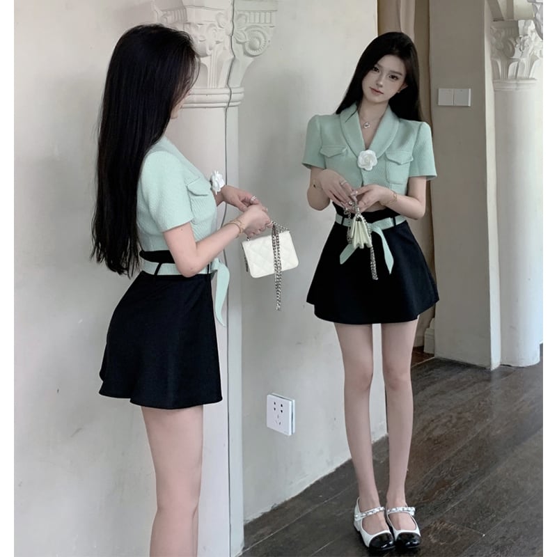 セットアップ OL/通勤ツイード オシャレ Vネック 3Dフラワー トップス+スカート グリーン+ブラック S M