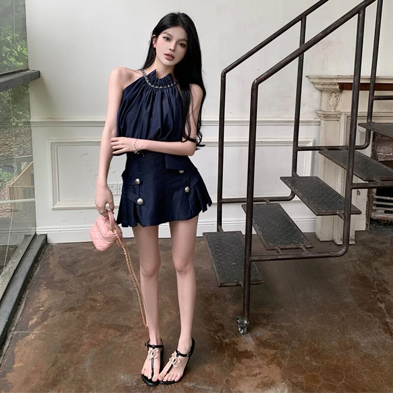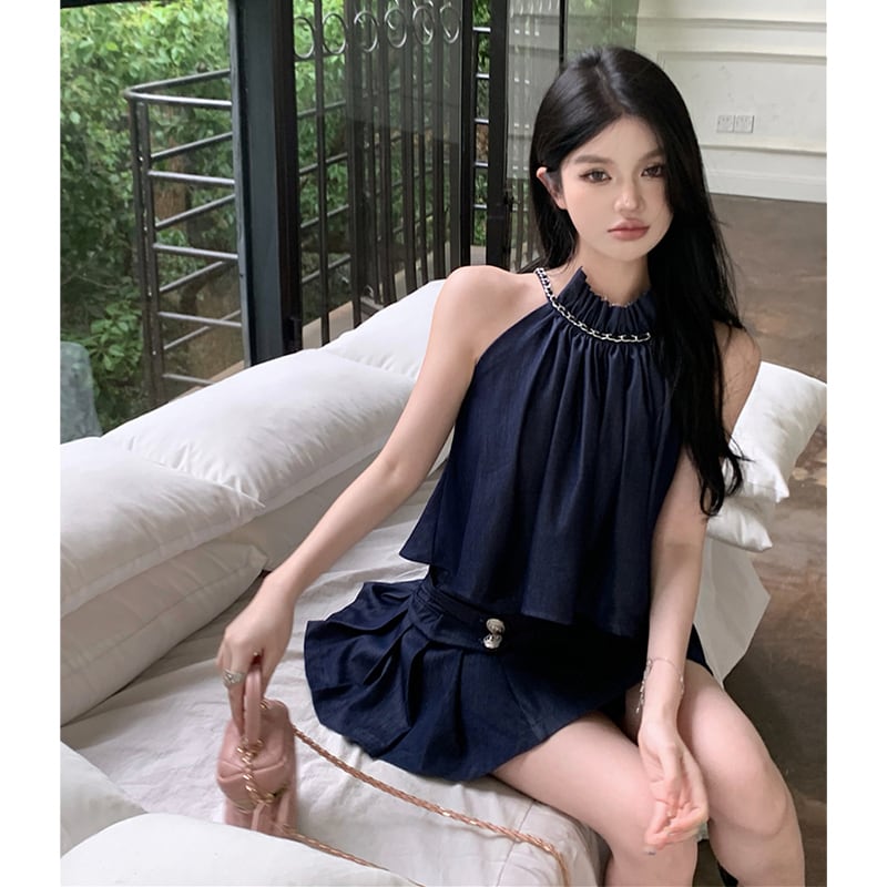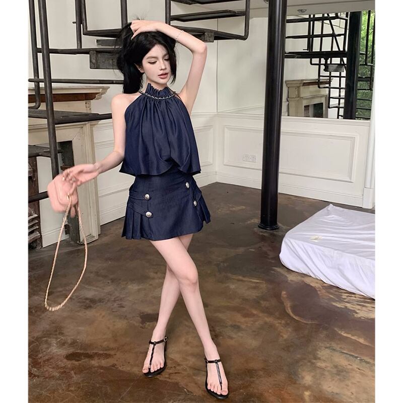 セットアップ OL/通勤 デニム オ ホルターネック ノースリーブ トップス+スカート S M L