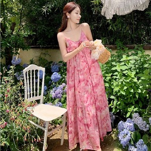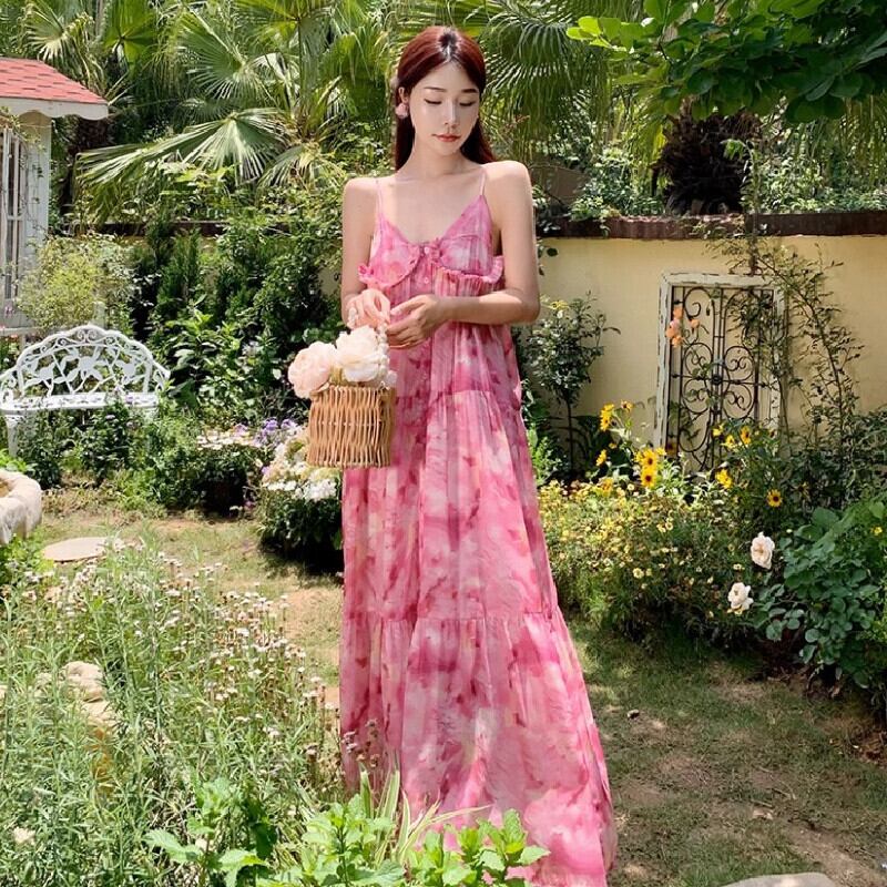 【SummerVacationシリーズ】吊りワンピース プリント 一目惚れ シフォン ピンク S M L XL