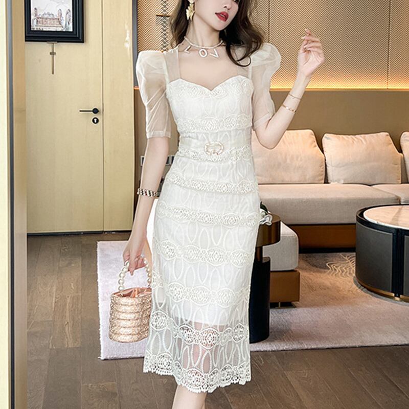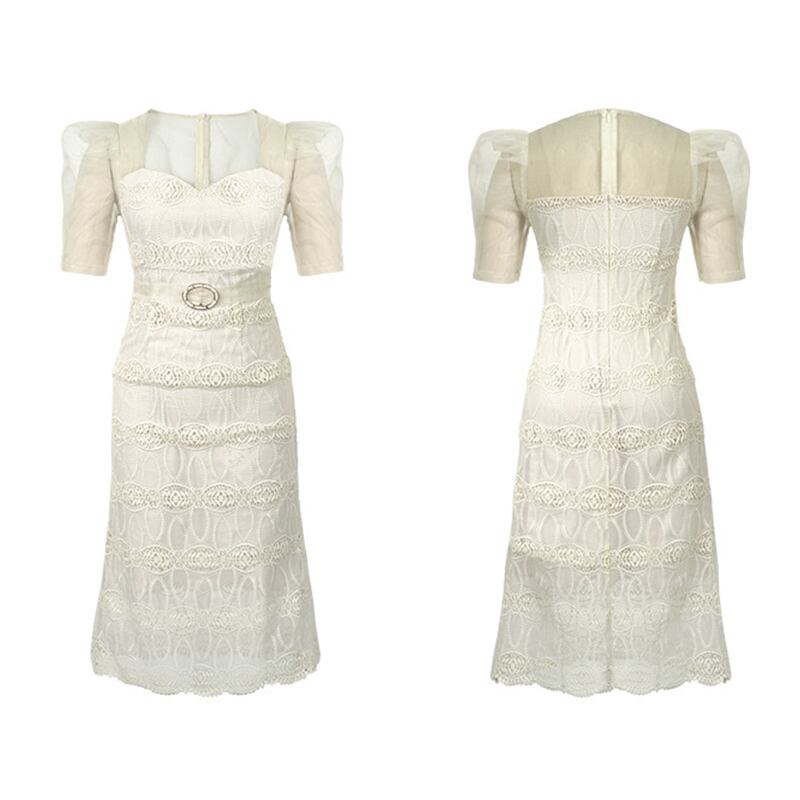 【夕暮薔薇シリーズ】ワンピース セクシー スクエアネック チュール素材 切り替え ベージュ S M L XL