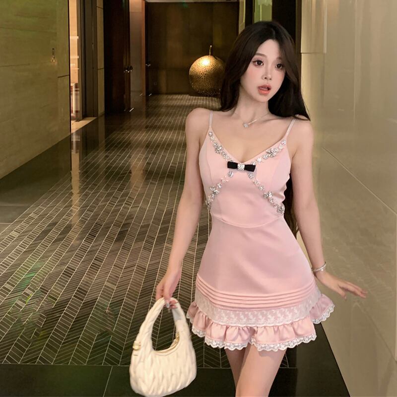 吊りワンピース セクシー スウィート ガーリー 蝶結び ラインストーン ピンク S M