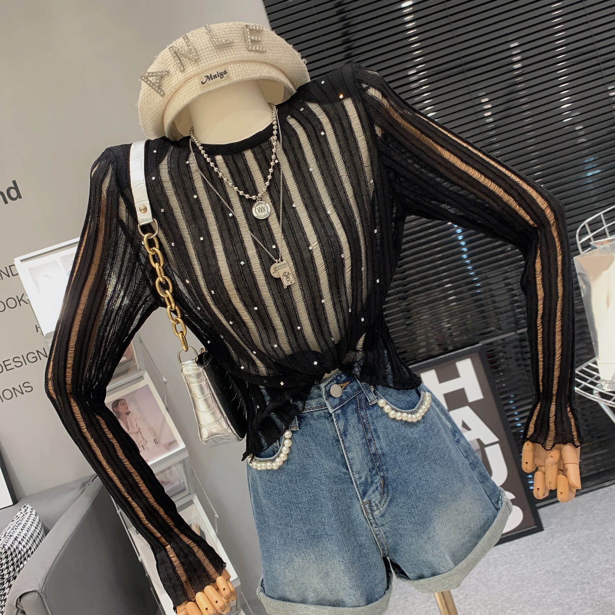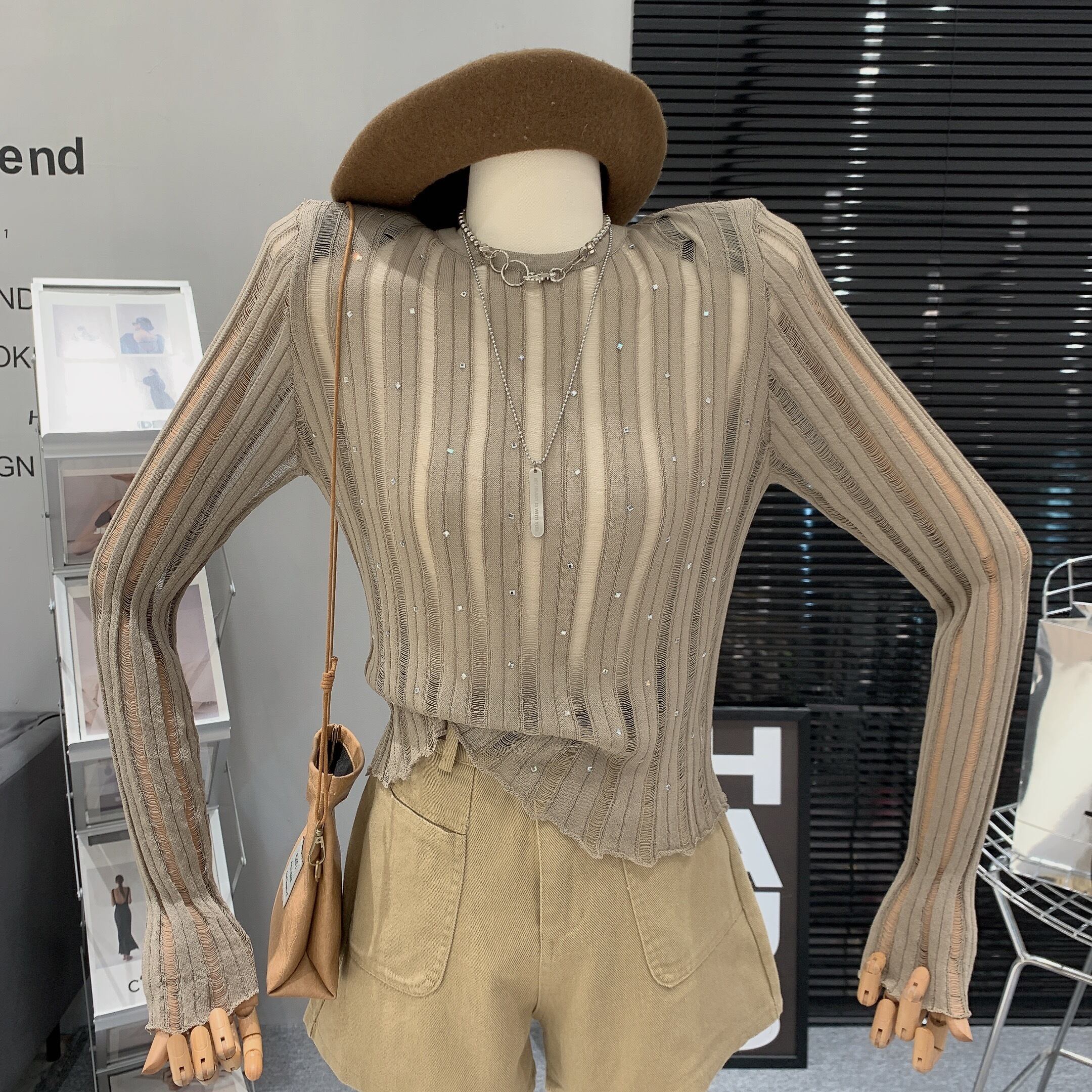 トップス Tシャツ 長袖 カジュアル 透かし彫り グリーン ダークベージュ ブラック ホワイト
