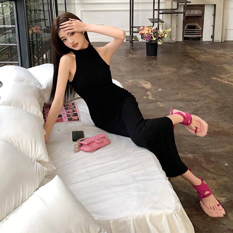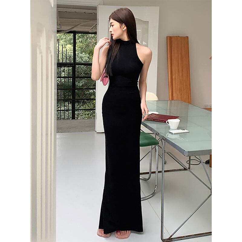 ワンピース セクシー ニット ロング丈 ノースリーブ バックスリット ブラック S M L