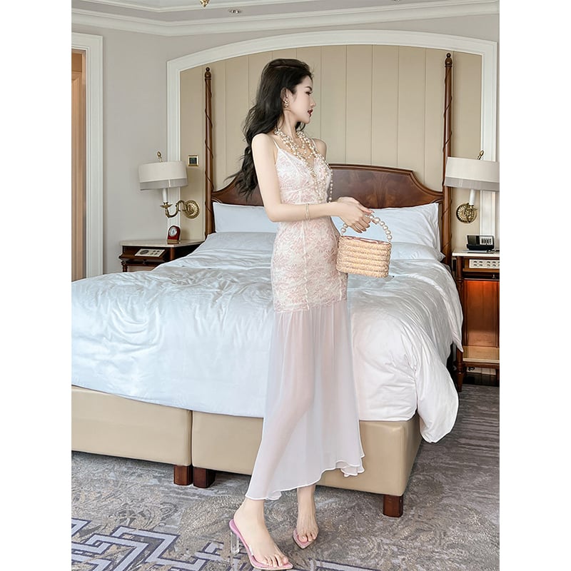 【夕暮薔薇シリーズ】吊りワンピース セクシー スウィート レース 切り替え ロング丈 ホワイト ピンク S M L XL