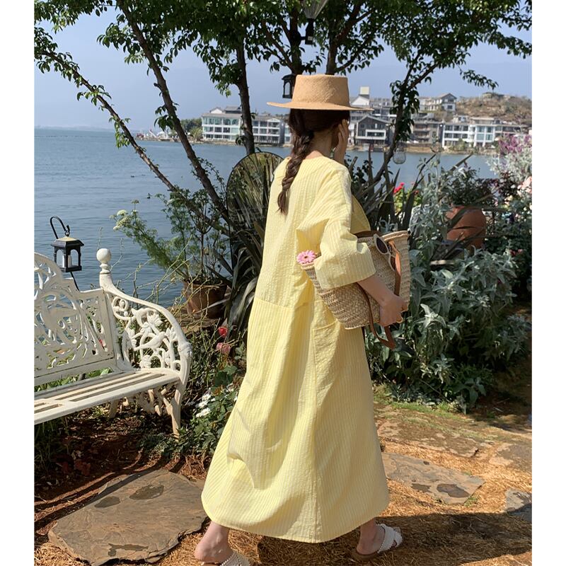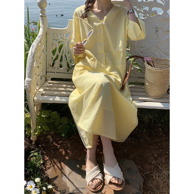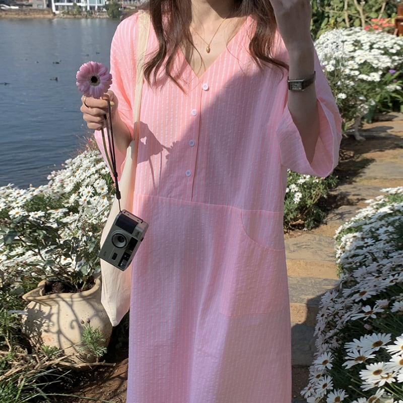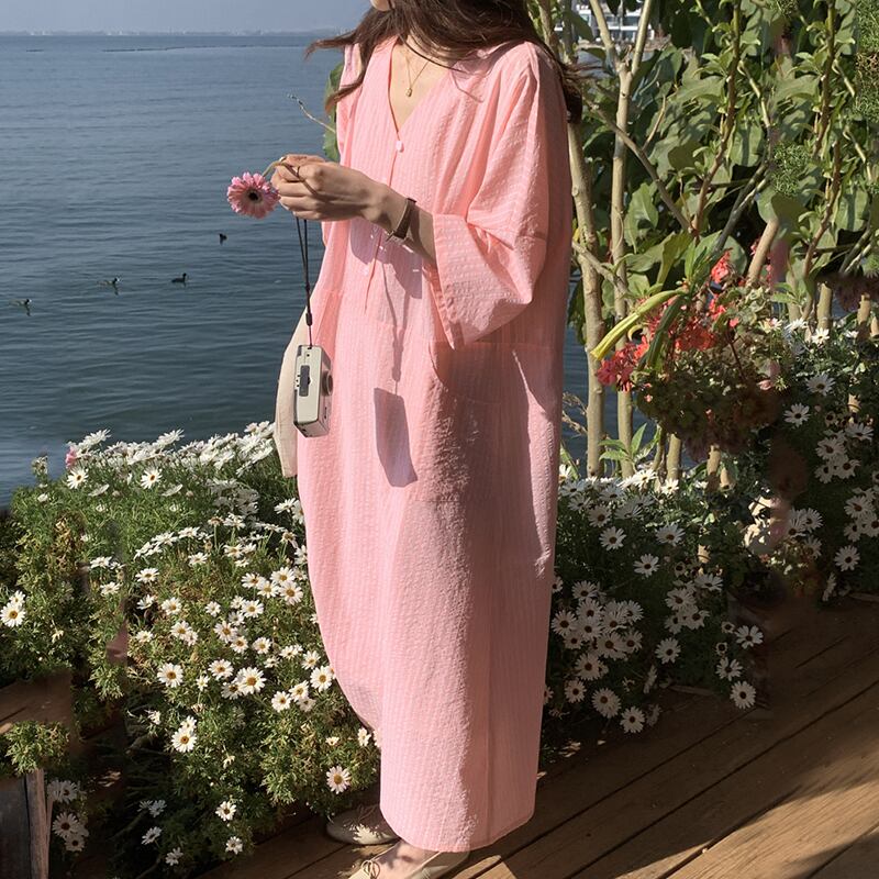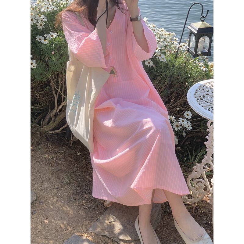 シャツワンピース Vネック 文芸風 清新 ルーズ ロング丈 ピンク イエロー