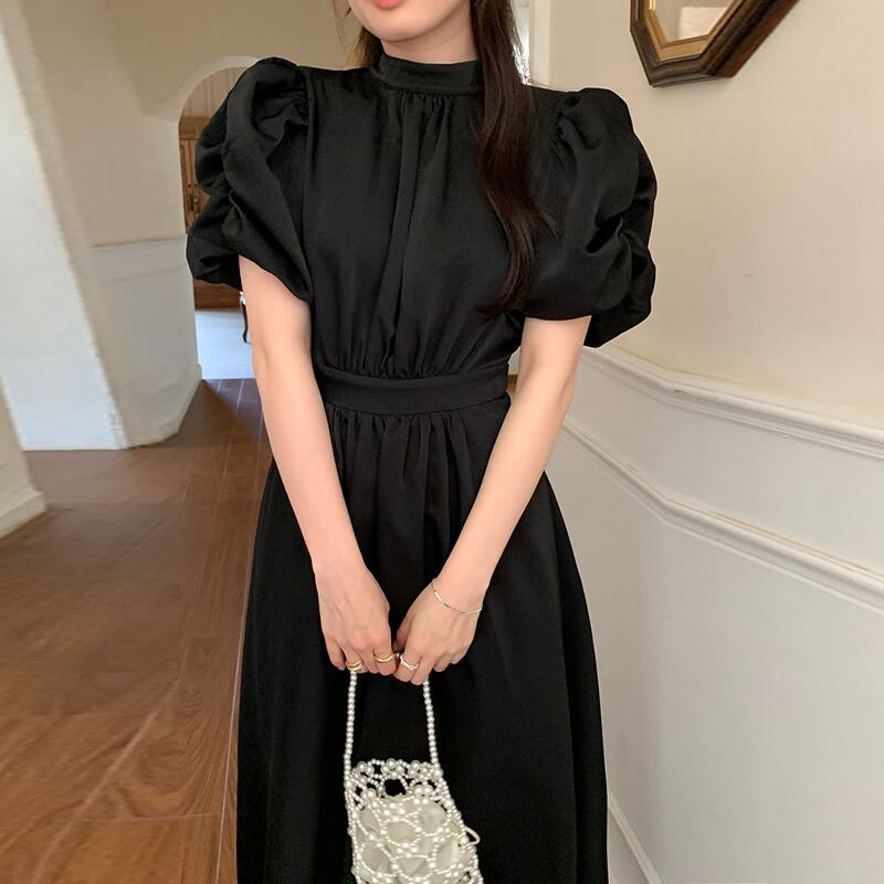 ワンピース デザイン感 バックリボン 背見せ ハイネック パフスリーブ ブラック ベージュ