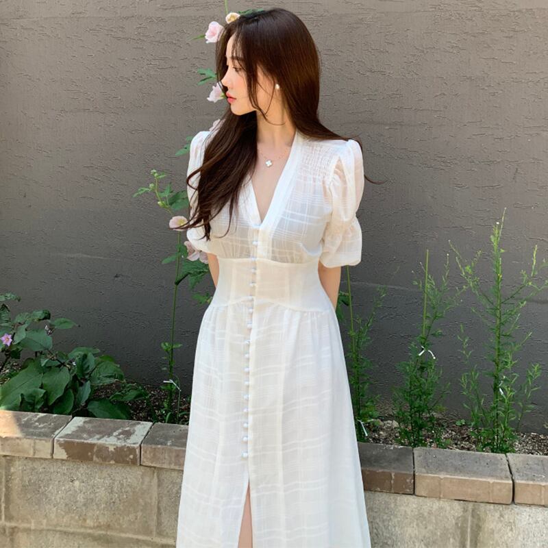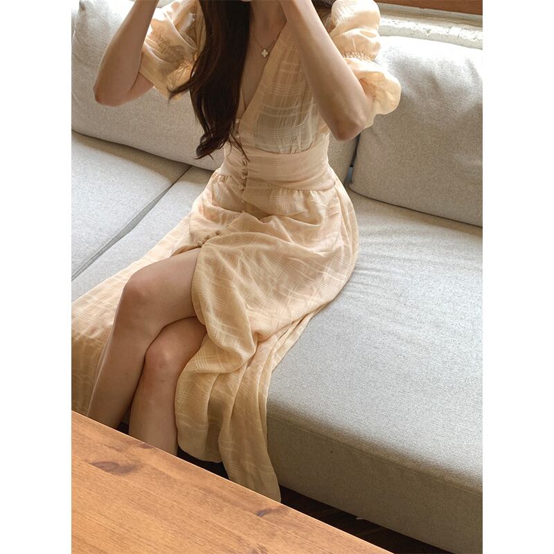 ワンピース デザイン感 セクシー パフスリーブ チェック柄 Vネック ホワイト ライトオレンジ S M L