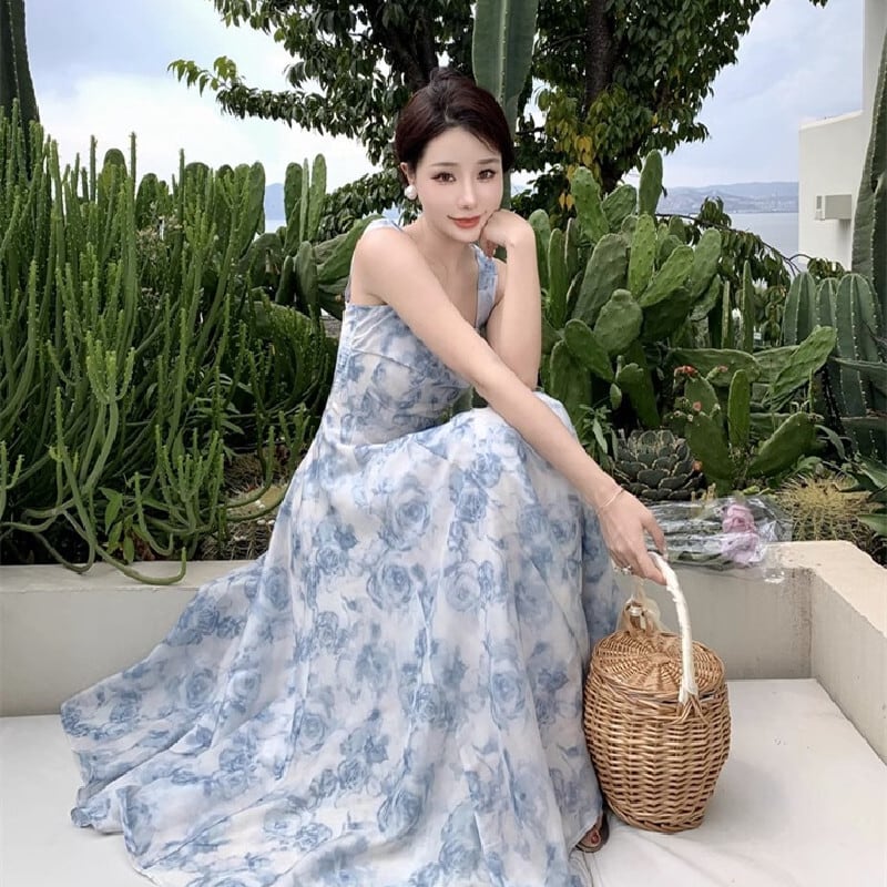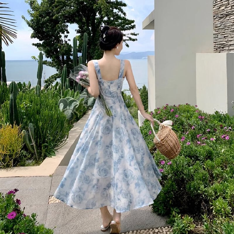 【SummerVacationシリーズ】ワンピース エレガント 水色 プリント 花模様 スクエアネック ブルー S M L XL