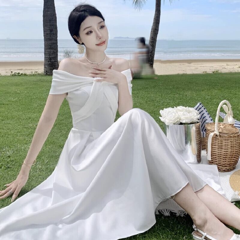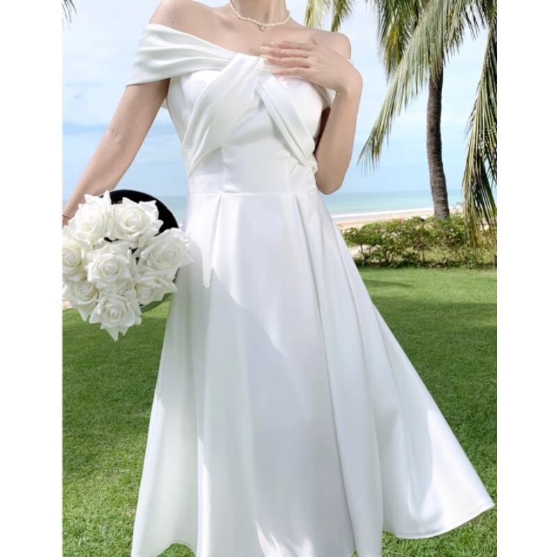 【SummerVacationシリーズ】ワンピース 白 ボートネックデザイン 無地 ホワイト S M L