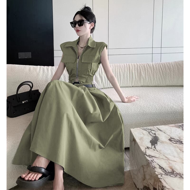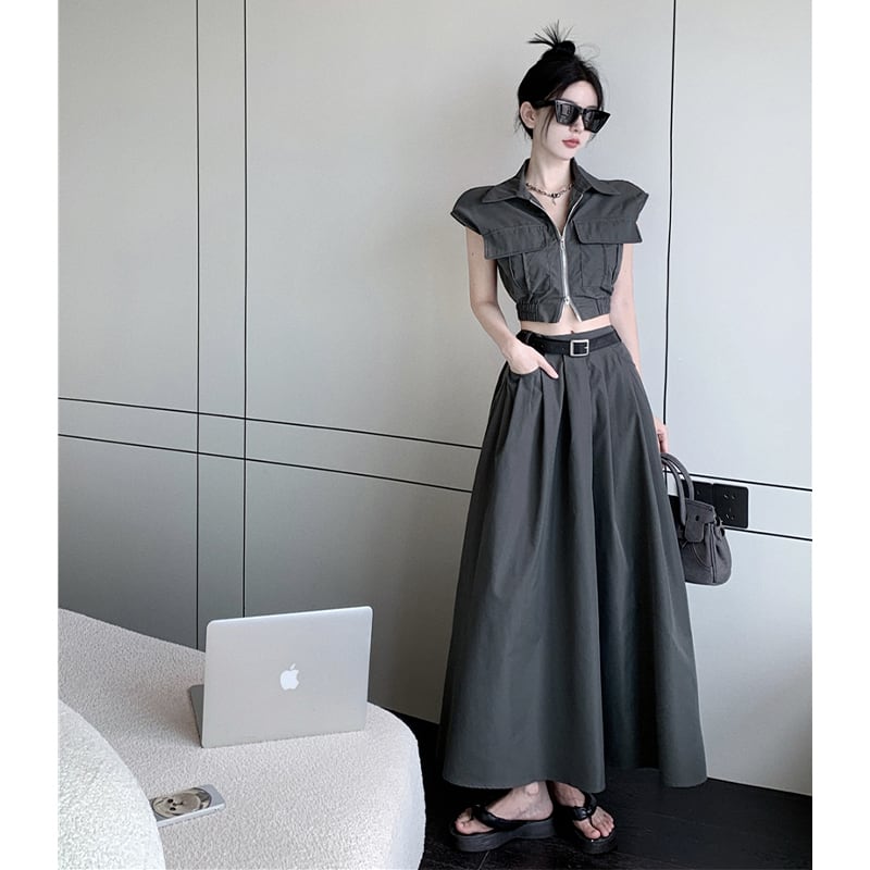 セットアップ クール POLOネック ファスナー トップス+スカート グレー ブラック グリーン S M L