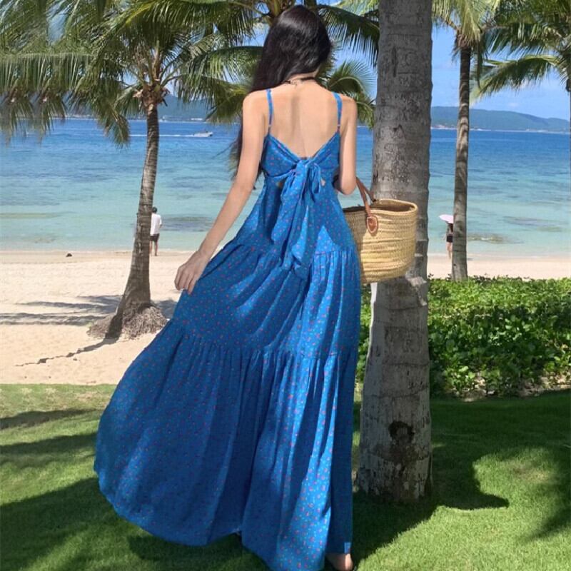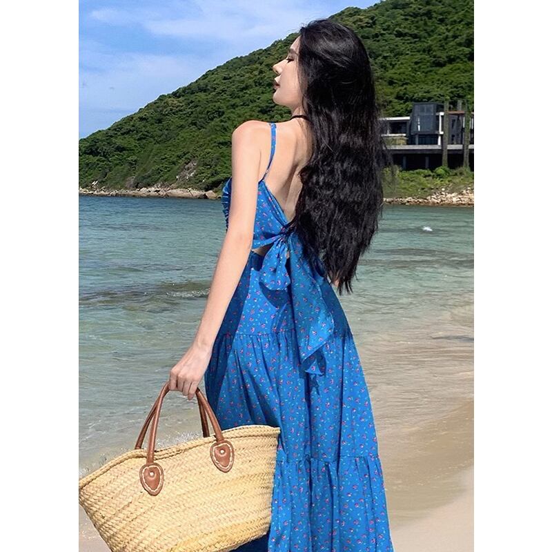 【SummerVacationシリーズ】吊りワンピース 藍 バックリボン 花柄 ロング丈 ブルー S M L