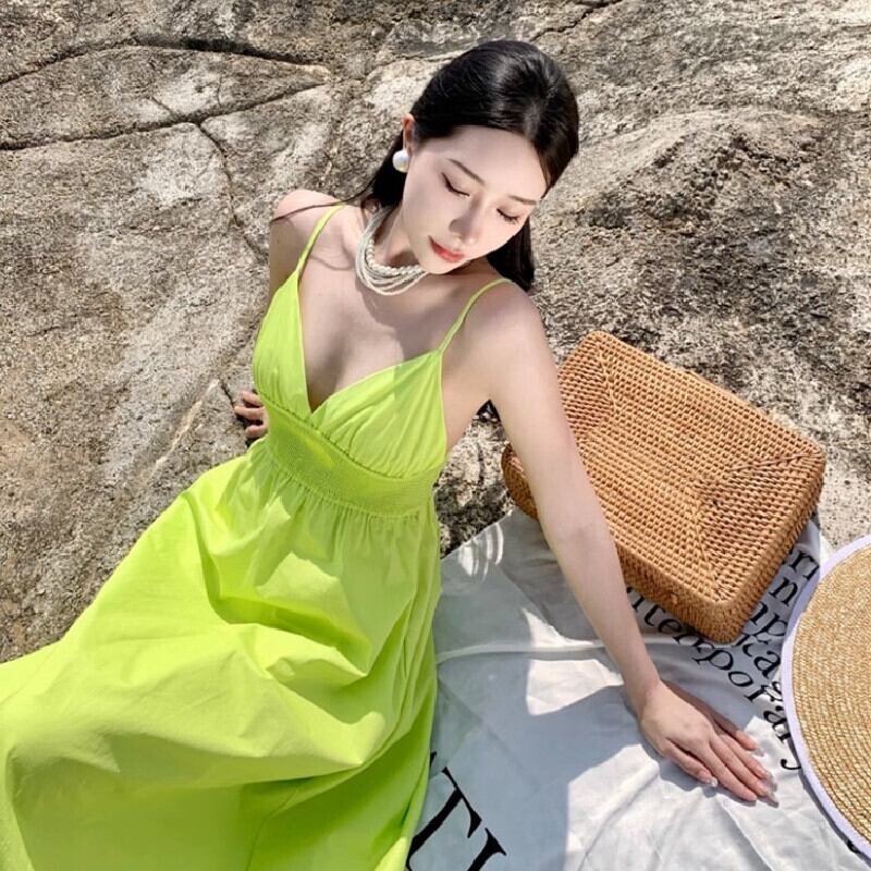 【SummerVacationシリーズ】吊りワンピース Vネック 大振裾 ロング丈 休日 グリーン S M L XL